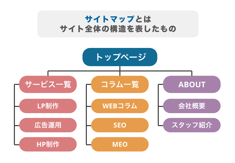 サイトマップとは、サイト全体のページ構成を地図のように一覧で記載しているファイルのことです。このファイルがあることで、検索エンジンはサイト内にあるページを認識し、各ページを正確に巡回することが可能になります。サイトマップを設置することで検索エンジンに素早く反映されるため、必ず設定を行いましょう。